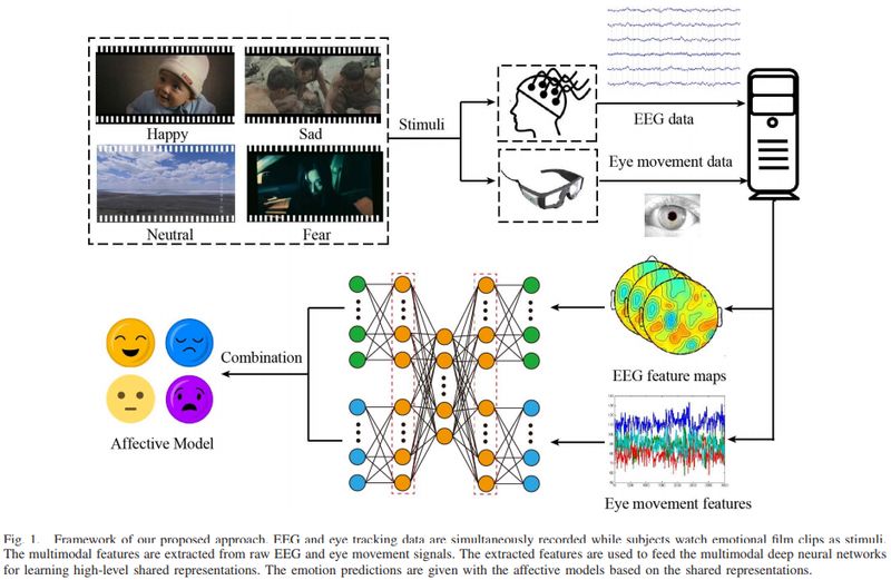 目前,大多数的研究都集中在听觉和视觉模态相结合的多模式情绪识别上,然而,来自中枢神经系统,例如 EEG 信号和外部行为,例如眼球运动的多模态结合已被证明是对情绪识别更加有效的方法。