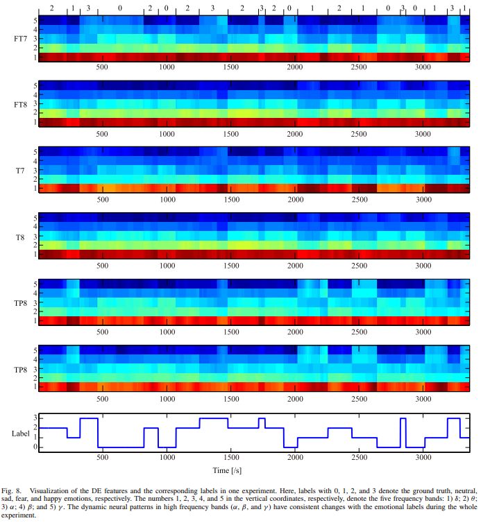 一次实验中,DE 特征的可视化显示和对应的情绪标签如图 8 所示,图中呈现了高频特征中的动态神经模式。从图中可以看出,delta 的 DE 特征没有显示出明显的变化,而 gamma 和 beta 反应与情绪标签具有一致性。