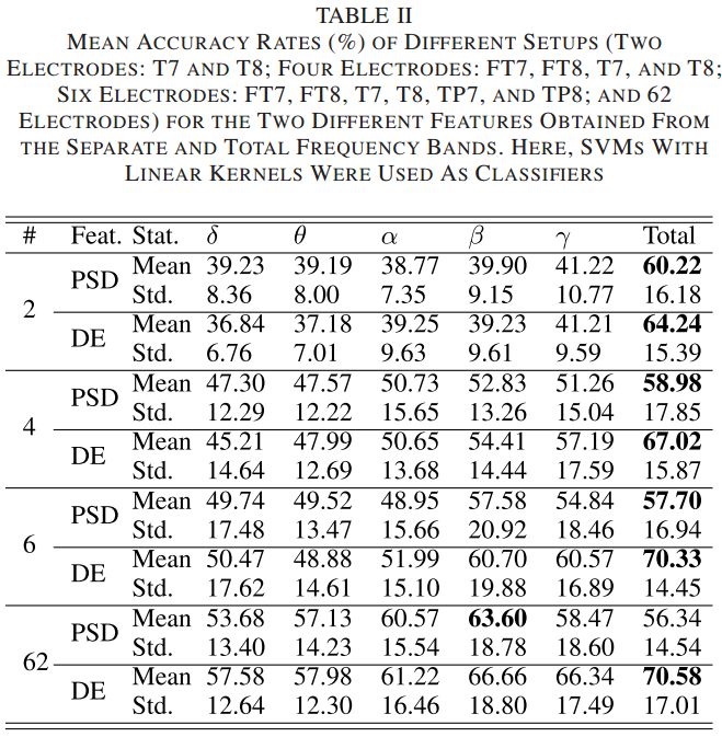 对于两个电极(T7和T8),四个电极(T7,T8,FT7和FT8)和六个电极(T7,T8,FT7,FT8,TP7和TP8)的 PSD 和 DE 特征的尺寸分别为 10,20 和 30。