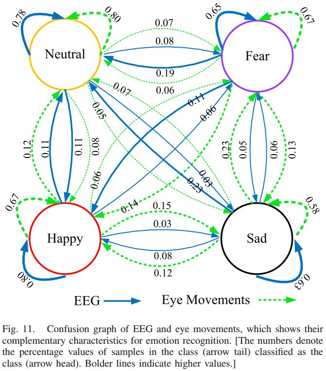 为了进一步研究脑电图和眼动数据的互补特征,我们分析了每种模态的混淆矩阵,揭示了每种模态的优缺点。图 10 和图 11 分别给出了基于眼动数据和脑电图的混淆图和混淆矩阵。实验结果表明脑电和眼动数据对情绪识别具有不同的判别力。结合这两种模式的互补信息,模态融合可以显着提高分类精度(85.11%)。
