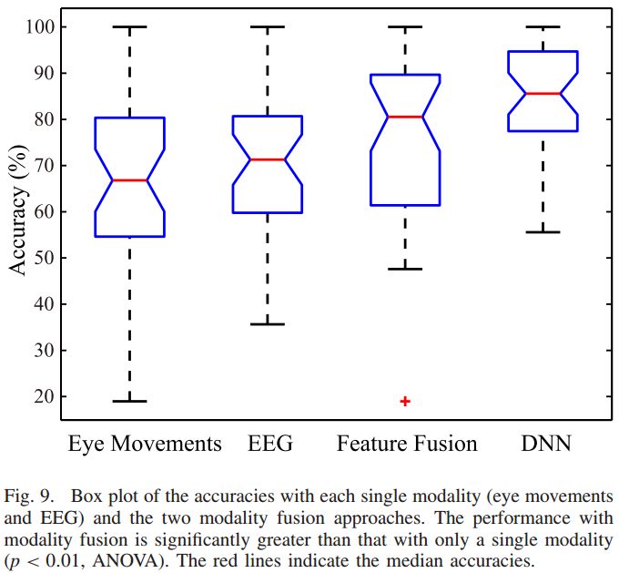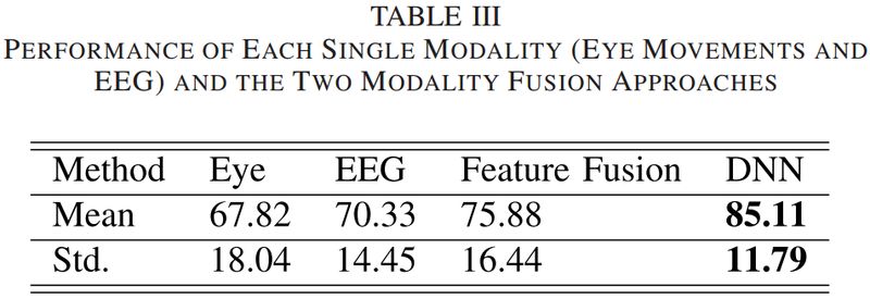 表 III 显示了每种单一模式(眼球运动和脑电图)和两种模态融合方法的表现,图 9 显示了使用不同模态的准确度盒形图。