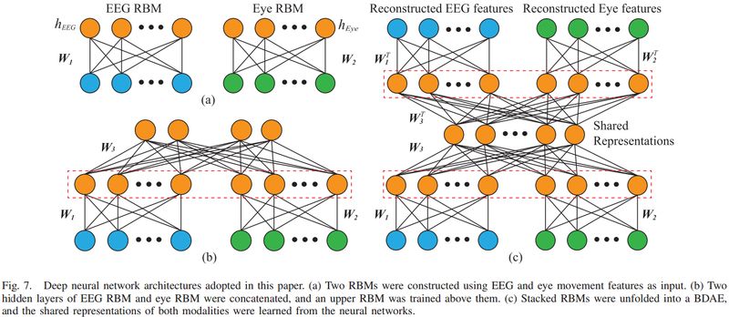 为了提高识别性能,我们采用双峰深度自动编码器(bimodal deep auto-encoder, BDAE)来提取脑电图和眼球运动的共有表示。图 7 描述了本文提出的深度神经网络的结构。
