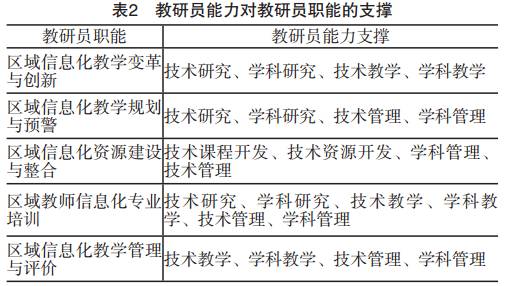 教研员能力直接指向教研员引领区域信息化教学的职能定位,是连接教研员知识与教研员职能的关键环节。表2则展示了教研员能力要素对教研员职能[28]的支撑情况,这对认识教研员知识、能力与职能之间的具体关系具有重要价值。