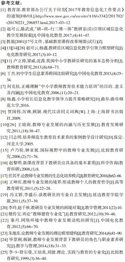 2017年,教育部根据《教育信息化“十三五”规划》的总体部署,研究制定了《2017年教育信息化工作要点》,将“以区域为单位整体推进教育信息化”和“持续做好教师和管理干部教育信息化培训”作为今后的重点任务[1]。该文件不仅表明整体推进教育信息化建设的“区域”单元指向,亦重申了提高教育教学管理者的信息技术素养对区域教育信息化的重要保障作用。县域教育局教研室是在区域层面落实基础教育课程改革和信息化教学发展的主要责任部门[2],教研员是将区域信息化教学发展整体布局落实到学校教学一线的关键推动者、引领者与实践者。随着信息技术与教育教学的深度融合,教研员实践领域不断拓宽,教研员职能亦随之延展。虽其仍被称为“教研员”,但从实际业务范围来看,已经远远超出单纯的“教学研究、指导与服务[3]”的范畴。在前期的研究中,着眼区域信息化建设实际,将教研员角色定位于“引领区域信息化教学发展”,并归纳了区域教研员的五大职能[4]。