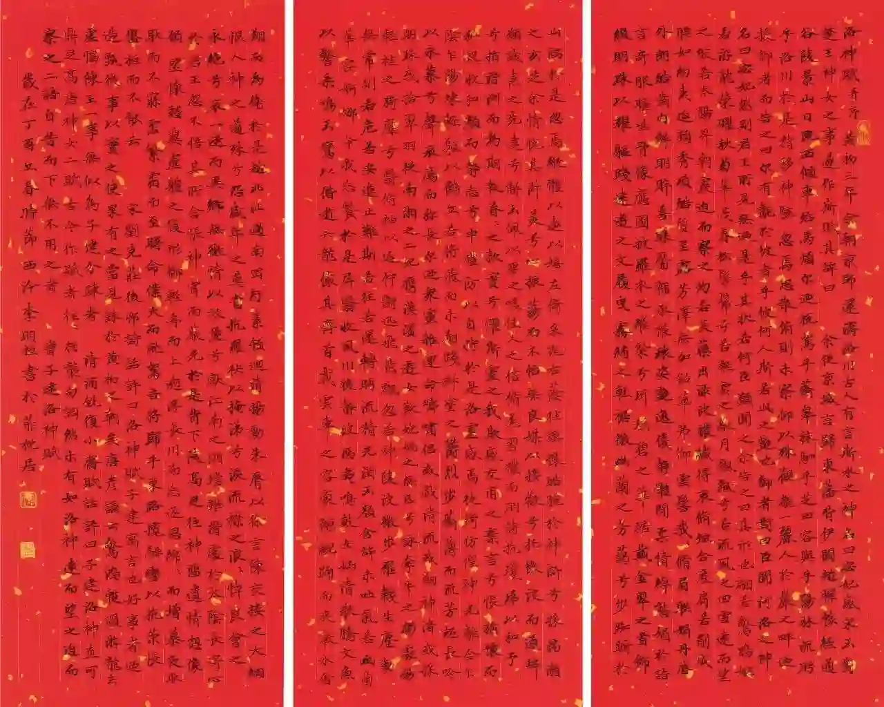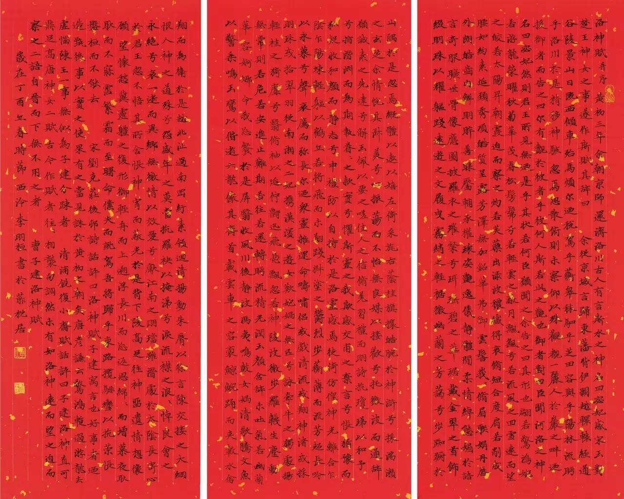 李明桓非常喜欢曹植的《洛神赋》,写法就与《正气歌》不同。他选用了红色洒金的粉蜡笺,「表现了一种逸美的意境,然后是虚灵之美,就像洛河的女神这么美丽动人」。粉蜡笺样式高贵,为反映女神与文字的意境,他给自己定的目标是飘逸、秀美,「不能像颜真卿(的字体)那样,雄浑地写《洛神赋》」。