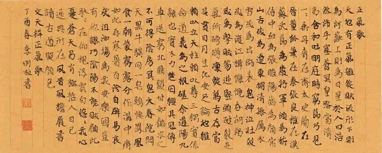 文天祥的《正气歌》,毫无疑问要写得雄浑,李明桓头一个想到的就是气势庄严的颜体。他尝试过清秀的写法,刚写前两行就放弃了。形式与内容相悖,感觉实在太怪异。