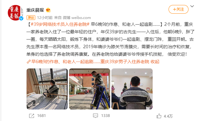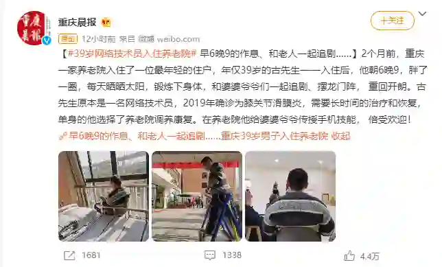 2 个月前,重庆一家养老院入住了一位最年轻的住户,年仅 39 岁的古先生——入住后,他朝 6 晚 9,胖了一圈,每天晒晒太阳,锻炼下身体,和婆婆爷爷们一起追剧、摆龙门阵, 重回开朗。古先生原本是一名网络技术员,2019 年确诊为膝关节滑膜炎,需要长时间的治疗和恢复,单身的他选择了养老院调养康复。在养老院他给婆婆爷爷传授手机技能, 倍受欢迎。