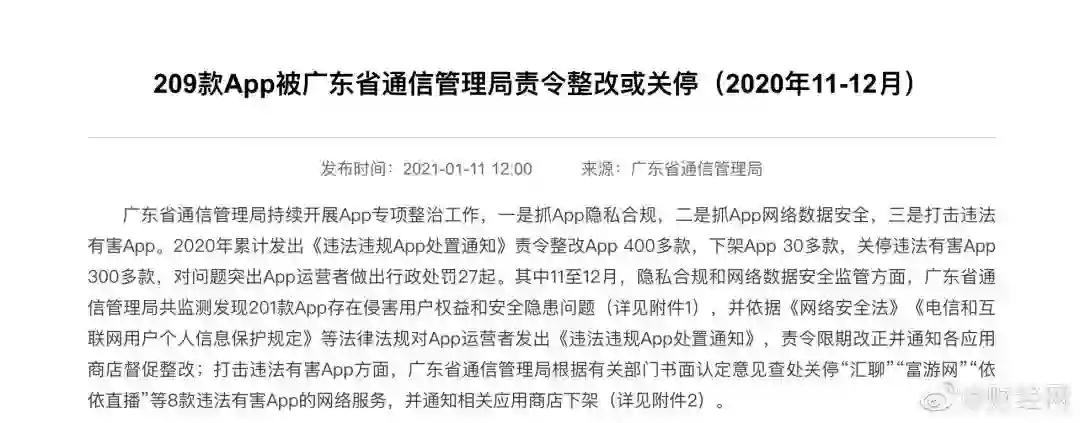 1 月 11 日,广东省通信管理局发布动态《209 款 App 被广东省通信管理局责令整改或关停(2020 年 11-12 月)》。其中,深圳市腾讯计算机系统有限公司旗下的 7 款 App 登榜,包括游戏类 App 手游宝、游戏类 App 天天象棋、工具类 App 逆战助手、工具类 App 腾讯游戏管家、工具类 App 腾讯游戏助手等。