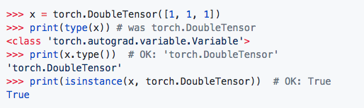 还要注意 Tensor 的 type( ) 不再反映数据类型。使用isinstance()或 x.type()来代替: