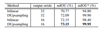 通过上表我们可以发现:1) 在相同条件下,DUpsampling效果优于bilinear。2)DUpsampling在output_stride=32的情况下效果与bilinear在output_stride=16的情况下结果相当。