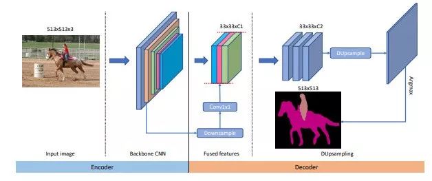 为了解决这个问题,本工作提出了Data-dependent Up-sampling (DUpsample),能够减少上采样操作对特征图分辨率的依赖,大量的减少计算量。同时得益于DUpsample, Encoder中的low-level feature能够以更小的运算量与Decoder中的high-level feature进行融合,模型结构如下所示: