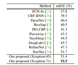 最后将我们的方法与最新的模型进行比较,结果如下(分别为PASCAL VOC与PASCAL context):