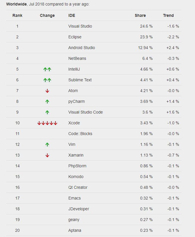 PYPL 7 月最新 IDE 指数已发布,搜索最多的前三大 IDE 依然是 Visual Studio、Eclipse 和 Android Studio 。其中,Visual Studio 和 Eclipse 的指数再次拉近,仅相差 0.7% 。
