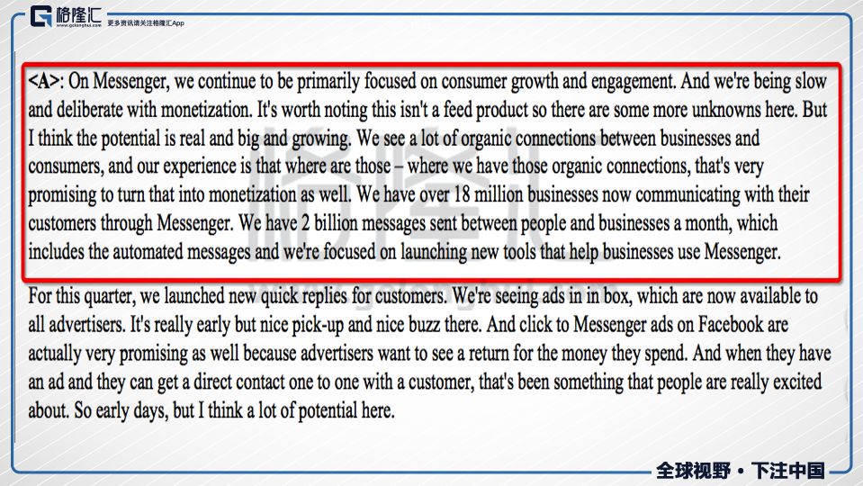 扎克伯格称,Messenger依旧处于获取用户的阶段,货币化程度还是非常低的,但是这个不是一款信息流产品,扎肯伯格认为messenger的未来是非常巨大的,并且还在成长。Messenger正在试图建立用户和商家的一些链接,从而帮助商家更好的使用messenger。