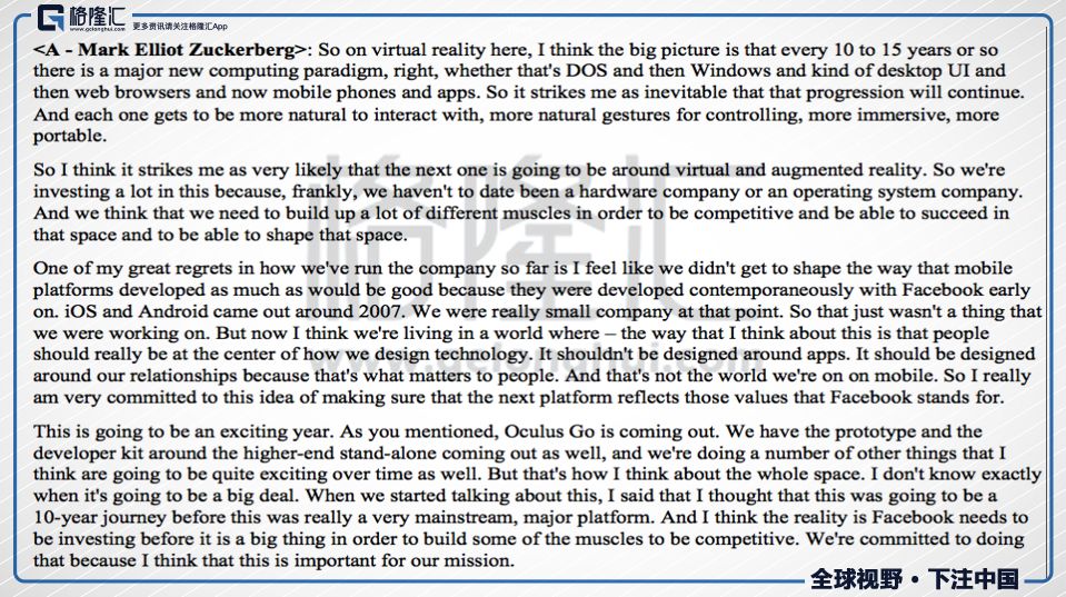 对扎克伯格而言,VR和AR就是移动互联网时代之后的下一个划时代产品,所以FB正在投入大量资金到这里来,但是这不会很快变现,需要很长时间。