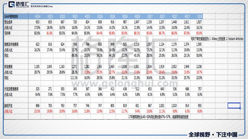 毛利率84%,2017年同期是86%,下降的主要原因有两个:1.Video的内容投资(谷歌的财报里已经有解释为什么记在营业成本里了)2.Instant Articles的会计准则从net accounting,改为gross accounting。