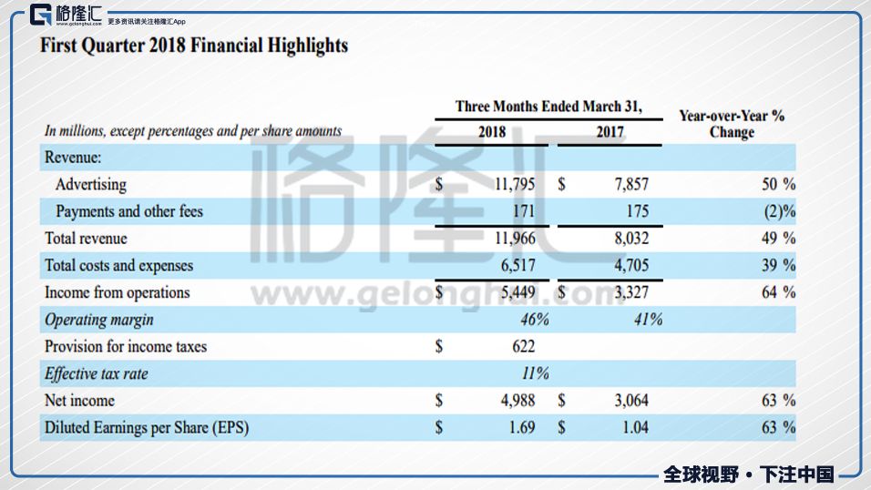 2018年Q1 FB的销售收入是119.66亿美金,销售收入同比增长50%,市场预期114.11亿美金,超预期5%,运营利润54.5亿美金,市场预期49.6亿美金。EPS为1.69美金,预期1.35美金。除此之外,总的费用同比上升39%,Operating Margin 同比上升5%,达到了46%,净利润同比上升63%。