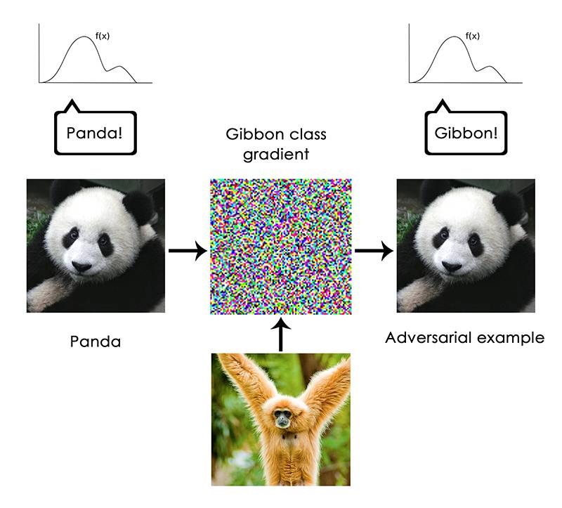 通常,这类行为被强调为对抗例子,是通过向深度学习网络输出错误的样本来欺骗模型进行分类。通过梯度上升,可以稍微修改图像,以便最大化给定类的预测。 通过拍摄一只熊猫,并添加一个“长臂猿”梯度,我们可以得到一个神经网络将这只熊猫分类为长臂猿。 这证明了这些模型的脆弱性,以及它们运行的输入到输出映射与我们自己的人类感知之间的深刻差异。