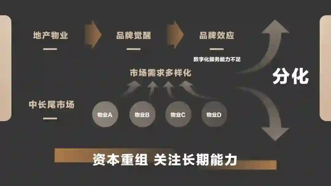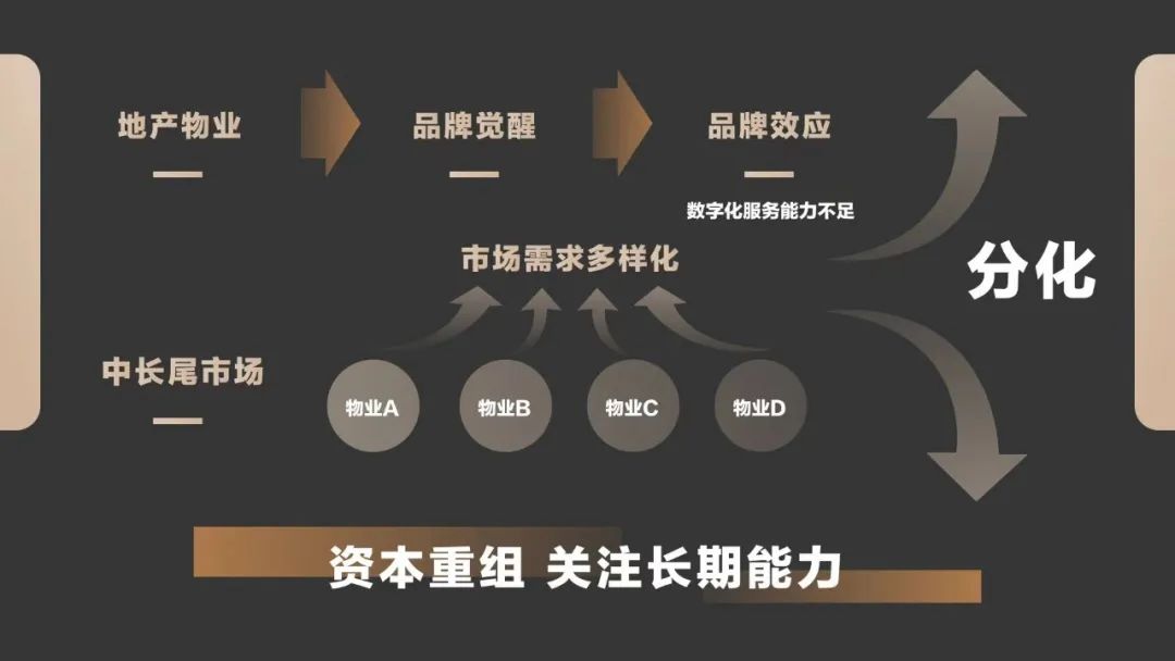头部市场对于高端物企的服务要求更多元也更定制,但这样的地产业态通常像高端酒店一样,很难集中,因此更适合做价值投资;而主力市场仍然在中长尾,因为这部分通常是典型且标准化的。