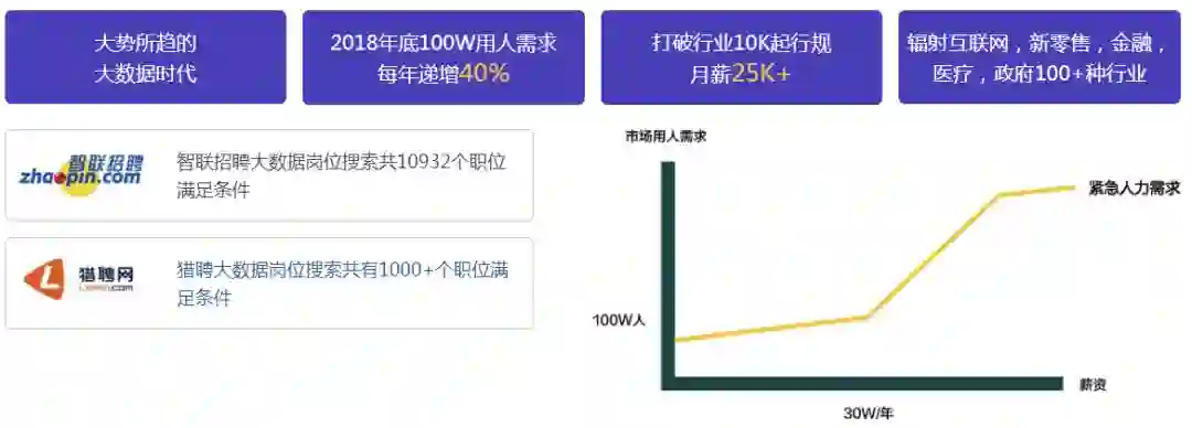 据国内知名企业调查发现,目前大数据人才需求在200万左右,而大数据人才从业者才50万左右,整体大数据人才缺口在150万;