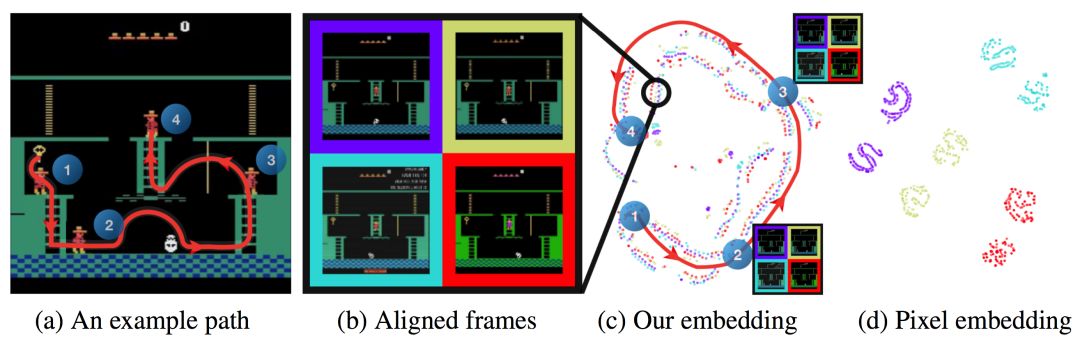正是基于这个思想,作者提出构建一种保持图像游戏状态信息的投影方法。如下图,图b中4个来源不同的游戏视频的投影用4种颜色表示在c和d中,图c是作者提出的投影方法,而图d是直接使用源图像源像素直接做投影。可以看到,图a中红色的角色移动路径在c中也是一条路径,说明c是保留了游戏状态信息,而忽略了画面差异的投影。而在d中,视频来源相同的图像聚类在了一起,不能表示出a中的游戏路径,说明主要聚类依据是视频来源的画面因素。