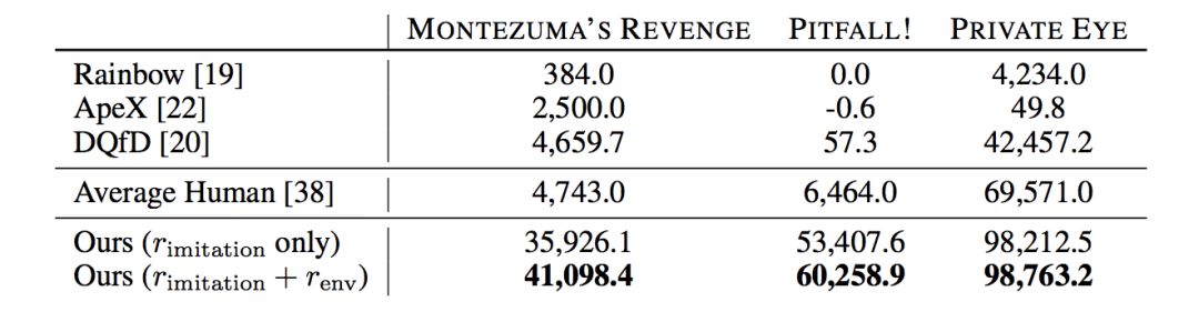 为了更好地探索游戏环境,作者在模仿学习的奖励的基础上,也加入了游戏环境本身得分Reward,这样能得到更好的性能,实验结果如下表: