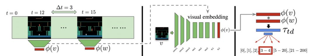 形成与游戏状态相关的投影的具体做法是,定义一个时序距离分类(Temporal distance classification, TDC)辅助任务。如下图,φ函数表示投影函数,v和w为视频中任意提取的两帧。训练一个分类器τ,τ(φ(v), φ(w)) 的作用是分类出v帧和w帧之间的时间差是多大,例如图中红框标出的[3 - 4],即是说v帧和w帧之间的时间差3在[3, 4]这个区间内。