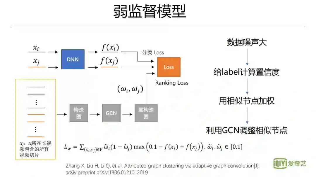 接下来我们再看一下,弱监督模型这一块。我们有很多用户观影行为数据,是否可用于拟合对分数的标注。比如观看行为,观看次数越高,一般也越精彩。但是不同视频本身热度不一样,同一个视频的不同部分,单纯看播放量也不公平,因为很多用户不会看完整个视频,一般前面的片段播放量会更高。所以,直接将用户行为作为精彩度的度量,虽然相对于人工标注的分数更能体现用户的实际偏好,但还是存在非常多的噪声。为了减少噪声影响,要做很多数据预处理,比如尽量避免用区分度不大的数据。除了关心绝对精彩度,也关心相对大小,即一个视频中,哪些内容相对其余部分更有吸引力。我们往往会从一个视频当中,筛选相对精彩的内容,去做二次创作、投放广告等。在这样的诉求下,可以采用Ranking思想去设计Loss。因为噪声较大,会给label计算置信度,比如可以用相似的样本来做平滑。这里我们还可以利用图,设计图卷积过滤高频信息更新样本feature,实现更好的聚类,并利用更新后的相近节点来修改样本置信度,最终有效提升弱监督模型效果。