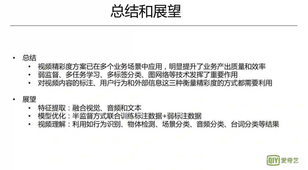 总结一下,当大家思考内容平台的时候,会非常关注内容是否精彩。针对精彩度分析,不只是一个单一的技术,更是一个综合性的解决策略。可能会利用各种各样的垂直算法、产品策略,工程策略等,最终形成可行方案。精彩度方案已被广泛应用,并会从质量和效率两个方面的提升来做评价。由于精彩度分析任务的特点,如需要用到海量数据、具有较强主观性、有很多用户行为数据等,会牵涉到很多技术方向,像弱监督、多任务、多标签、图等等。此类偏主观的分析,用户标准、用户行为以及先验的外部信息,这三个维度都非常重要。