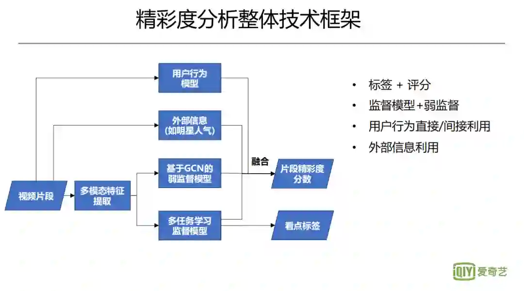 这就促使我们去思考,如何分析内容的精彩度,这里有几个维度:第一,内容标签,比如打斗等偏感官层面的信息或者是浪漫等偏高层语义方面的信息,这需要理解视频内容。第二方面是程度等级,比如说打斗,如果是武林高手之间的对决,相比于我们普通人之间打斗会更精彩,所以需要一个分级打分机制。还有一些信息影响到用户对视频的喜好,比如对明星、IP、剧集等的喜爱,都会影响用户对其精彩度的判断。前面这3点是人们对于视频精彩度的一个理性分析,但实际上精彩度还是较主观的看法,同一个视频,有些人觉得精彩,有些人则不觉得。一些上映之后成为收视率“黑马”的作品,在上映之前,人们没有预期到其足够精彩,上线之后,却成为爆款,这体现了对精彩度主观判断的局限性,因此我们也要考虑视频上线后的用户反馈。比如用户的播放、弹幕等行为,有些视频片段用户会反复播放,另一些则会被跳过。我们希望通过以上几个方面,构建对于精彩度的认知。