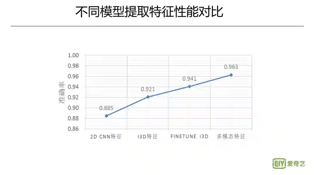 这张图显示了采用不同的模型提取特征,对最终精彩度输出的影响。最初的方法是针对图片信息采取2D的CNN,再去对帧级别feature进行融合;接着考虑由时序上的3D卷积模型来提特征;然后尝试根据预训练模型来进行微调;再利用视觉+音频的多模态的信息进一步提升。