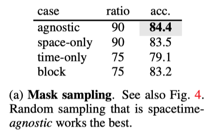 时空不可知采样可以比结构感知采样策略更有效。如上图b和c所示,仅空间或仅时间采样可能保留较少的信息,并产生非常困难的预训练任务。例如,掩蔽率为87.5%的8帧仅进行时间采样意味着只保留一帧,这就提出了一项非常具有挑战性的任务,即仅在给定一帧的情况下预测未来和过去。作者观察到,结构感知采样的最佳掩蔽比通常较低。相比之下,时空不可知采样更好地利用了有限数量的可见patch,因此允许使用更高的掩蔽率。