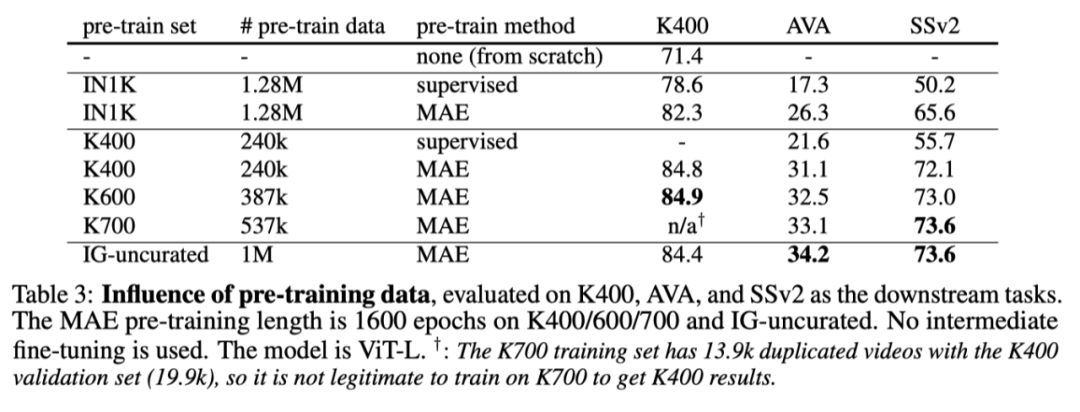 上表展示了用于MAE预训练的真实Instagram数据。作者对每一组MAE进行200、400和800个epoch的预训练,并比较了K400上的微调精度。模型为ViT-L。