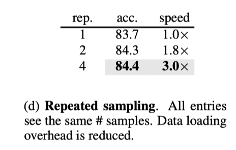 由于本文的方法计算速度快,需要采用重复采样来减少数据加载开销。上表报告了其影响。重复使用2到4次可将wall-clock速度提高1.8倍或3.0倍,因为加载和解压缩的文件可重复使用多次。