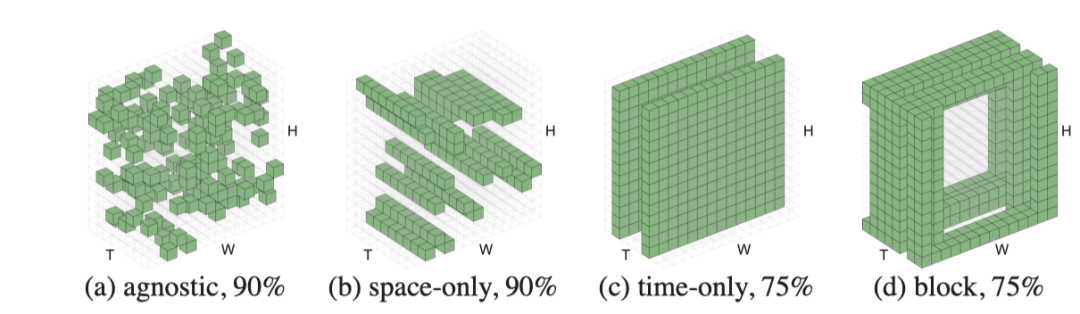 作者从嵌入的patch集中随机抽取patch。这种随机抽样与时空结构无关,如上图a。这种结构不可知的采样策略类似于1D中的BERT和2D中的MAE。