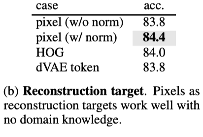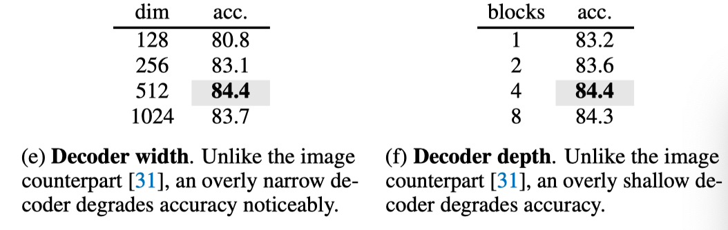 上图显示了掩蔽率与预训练周期的联合影响。90%的比例效果最好。95%的比例表现得出奇地好,如果训练足够长的时间,这可以会赶上。较高的掩蔽率导致编码器编码的token较少;为了更全面地查看,作者绘制了编码token总数和准确率的影响(上图右侧)。在这一衡量标准下,90%和95%的比率表现密切。