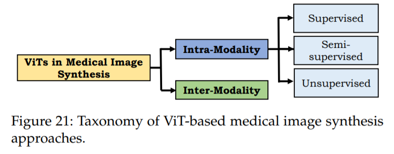 在本节中,我们将概述VIT在医学图像合成中的应用。大多数这些方法都包含了对抗性损失,以合成真实和高质量的医学图像,尽管代价是训练不稳定[314]。我们进一步将这些方法分为模态内合成和模态间合成。
