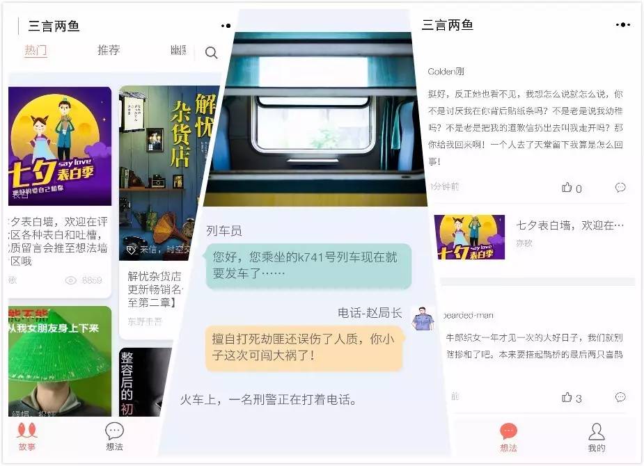 “三言两鱼”还会提供具有社交性的内容,引导用户间互动。例如,团队结合七夕节,推出“七夕表白墙”,通过抛出男女对话的短故事,来吸引用户评论留言。