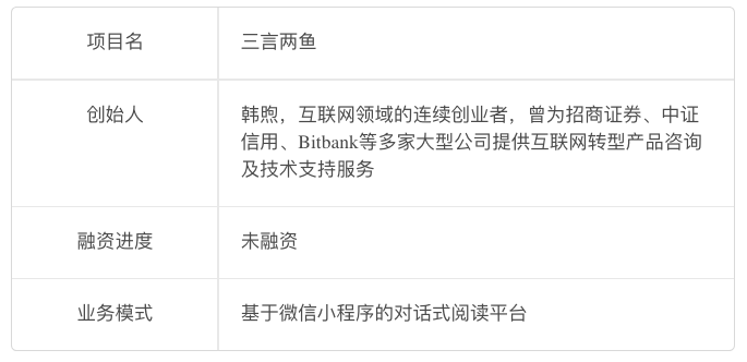 “三言两鱼”已启动150万元天使轮融资,预计出让股份10%。资金将主要用于提升内容生产能力、完善产品和依托微信进行推广。