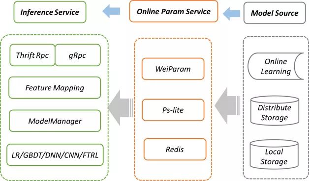 多源支持:对于普通离线学习,模型会导出到文件中,WeiServing通过ModelManager模块管理模型加载,支持本地存储与分布式存储。同时,WeiServing为支持在线机器学习,提供对实时流接口对接,在线训练的模型参数可以实时推送到WeiParam中,为线上提供服务。
