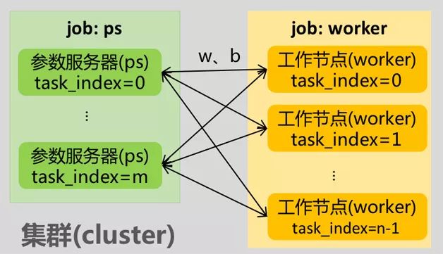 分布式训练:如果训练时间长或者样本规模大,超过单台服务器能力时,需要支持分布式训练。以TensorFlow分布式运行方式为例进行说明,如图5所示。一个TensorFlow分布式程序对应一个抽象的集群,集群(cluster)由工作节点(worker)和参数服务器(parameter server)组成。工作节点(worker)承担矩阵乘、向量加等具体计算任务,计算出相应参数(weight和bias),并把参数汇总到参数服务器;参数服务器(parameter server)把从众多工作节点收集参数汇总并计算,并传递给相应工作节点,由工作节点进行下一轮计算,如此循环往复。