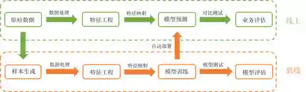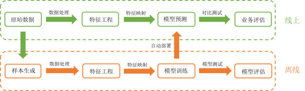WeiFlow的诞生源自于微博机器学习的业务需求。在微博的机器学习工作流中(如图2所示),多种数据流经过实时数据处理,存储至特征工程并生成离线的原始样本。在离线系统,对原始样本进行各式各样的数据处理、特征处理、特征映射,从而生成训练样本;业务人员根据实际业务场景(排序、推荐),选择不同的算法模型,进行模型训练、预测、测试和评估;待模型迭代满足要求后,通过自动部署将模型文件和映射规则部署到线上。线上系统根据模型文件和映射规则,从特征工程中拉取相关特征,根据映射规则进行预处理,生成可用于预测的样本格式,进行线上实时预测,最终将预测结果(用户对微博内容的兴趣程度)输出,供线上服务调用。