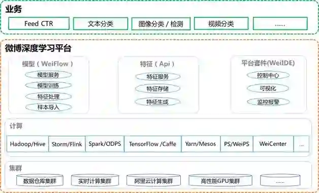 微博在Feed CTR、反垃圾、图片分类、明星识别、视频推荐、广告等业务上广泛使用深度学习技术,同时广泛使用TensorFlow、Caffe、Keras、MXNet等深度学习框架。为了融合各个深度学习框架,有效利用CPU和GPU资源,充分利用大数据、分布式存储、分布式计算服务,微博设计开发了微博深度学习平台。