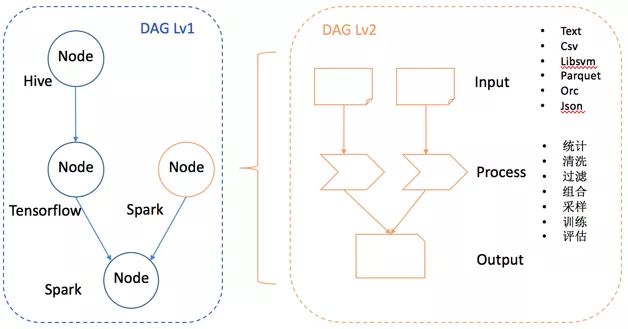 外层DAG设计的初衷是利用各个计算引擎的特长,同时解决各个计算引擎间的依赖关系和数据传输问题。内层的DAG,利用引擎的特性与优化机制,实现不同的抽象作为DAG中计算模块之间数据交互的载体。