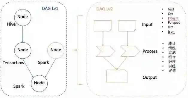 为了应对微博多样的计算环境,WeiFlow采用了双层的DAG任务流设计,如图3所示。外层的DAG由不同的Node构成,每一个Node是一个内层的DAG,具备独立的执行环境,即上文提及的Spark、TensorFlow、Hive、Storm、Flink等计算引擎。