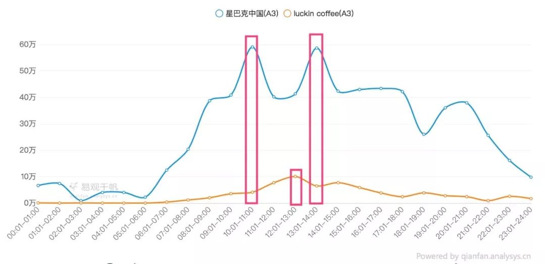 有意思的是,我们通过易观千帆数据发现,在用户使用习惯上,星巴克中国和瑞幸咖啡活跃规模明显形成高峰错位的态势。