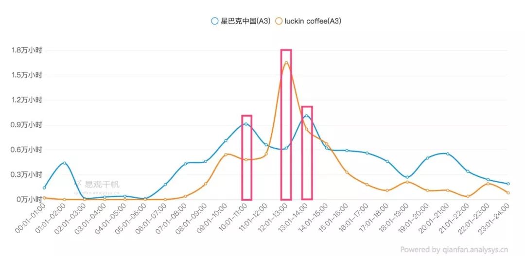 瑞幸咖啡、星巴克中国APP用户分时使用时段对比
