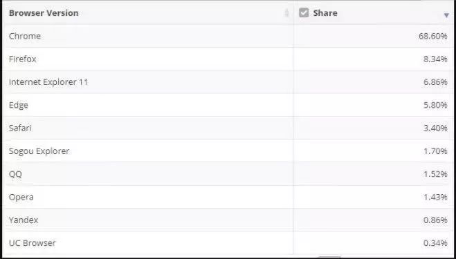 7月份额报告显示,68.60%的份额远高于排名第二火狐浏览器的8.34%,而第三的IE 11是6.86%,简直就是一家独大。