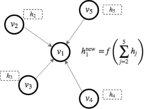 比如常见的卷积图神经网络 GCN(Graph Convolutional Network)可以用下图中的消息传递模式进行表示(图中 h 表示节点各自的特征)。用户可以定制化消息函数(message function),以及节点的累和更新函数(reduce function)来构造新的模型。事实上,在 Google 的 2017 年的论文中 [Gilmer et al. 2017] 将很多图神经网络都归纳到了这一体系内。