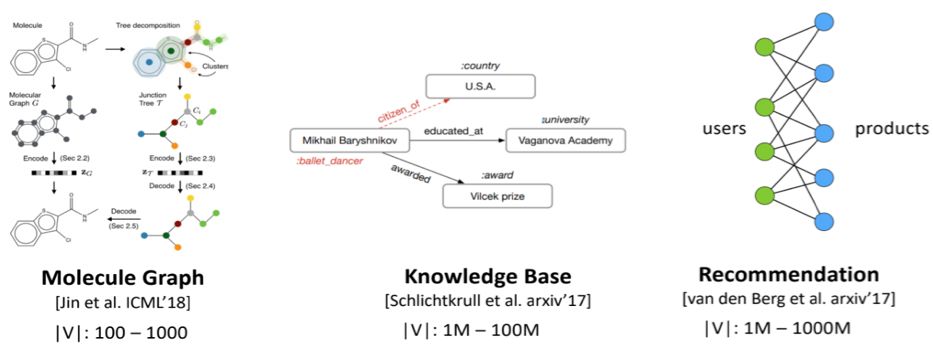 小到分子结构图([Gilmer et al., 2017], [Jin et al., 2018]),大到知识图谱([Schlichtkrull et al., 2017])、社交网络和推荐系统([Ying et al., 2018]),图神经网络都展现了强大的应用潜力。
